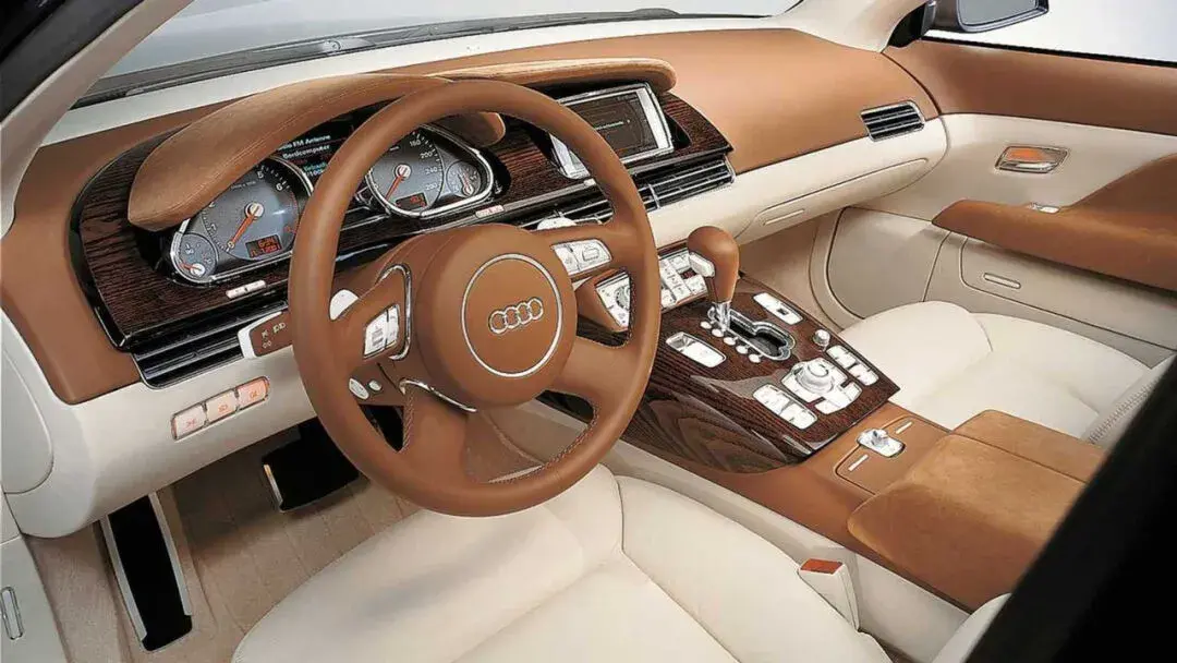 車廂內飾十分豪華,采用大量皮質軟包,首度出現了中控屏幕,搭載奧迪自研的MMI操作系統,通過旋鈕和按鍵操作功能菜單。此外還搭載指紋識別系統,可以識別車主身份,自動調節座位等功能,這些設計大部分都被應用在后續D3平臺的A8上。