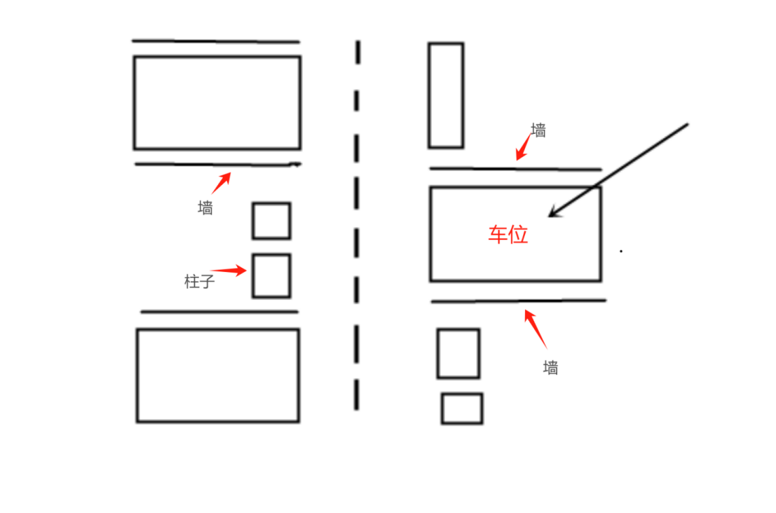去了之后又發現,她的車位不僅兩邊是柱子,而且旁邊還是防火通道,也就是下面這張圖這種情況,別說她了,就連我這個老司機都倒了好幾把才幫她停好。