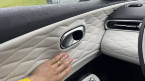首先就拿這個價位少有的內飾用料來說,大多數都不會用上皮質材料。但納米01卻不同,幾乎只要是用了軟包的地方都是皮革包覆。并且它還做了一個很好的示范,就是在我們身體經常接觸到的地方,包覆的厚度則會更厚。比如它門板上的包覆,是我試過的所有A0級電動車中最為厚實的,而且皮質還非常柔和。