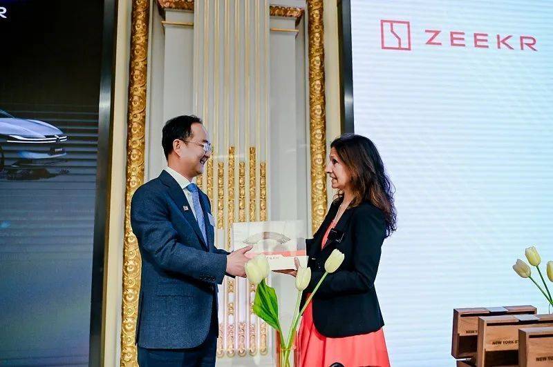 ▲極氪CEO安聰慧代表極氪與紐交所主席互換上市紀念禮物