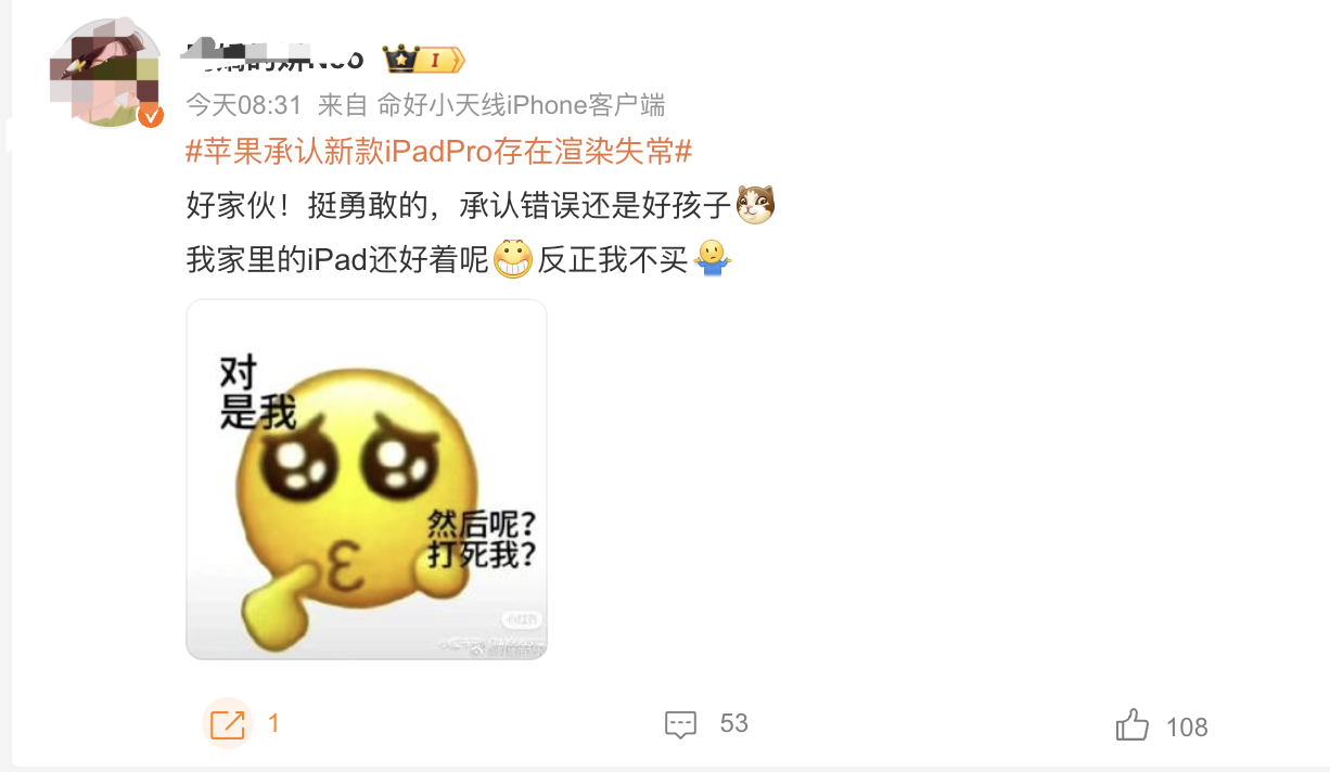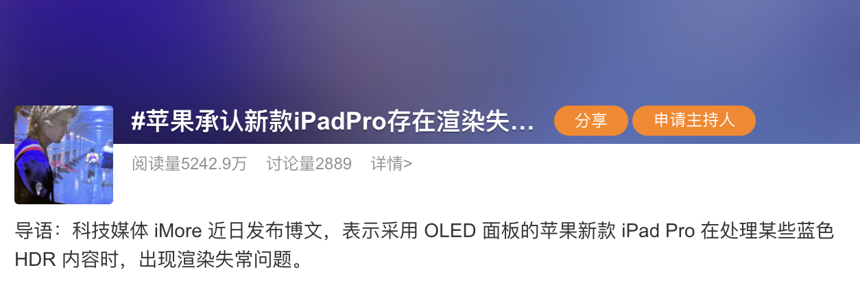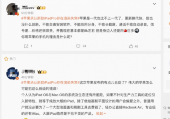 對于此問題,蘋果公司很快做出了回應,表示公司已經意識到這個問題,并在開發一款軟件更新來解決。今天一大早,"蘋果承認新款iPad Pro存在渲染失常"還登上了熱搜,有千萬網友在該話題下討論。