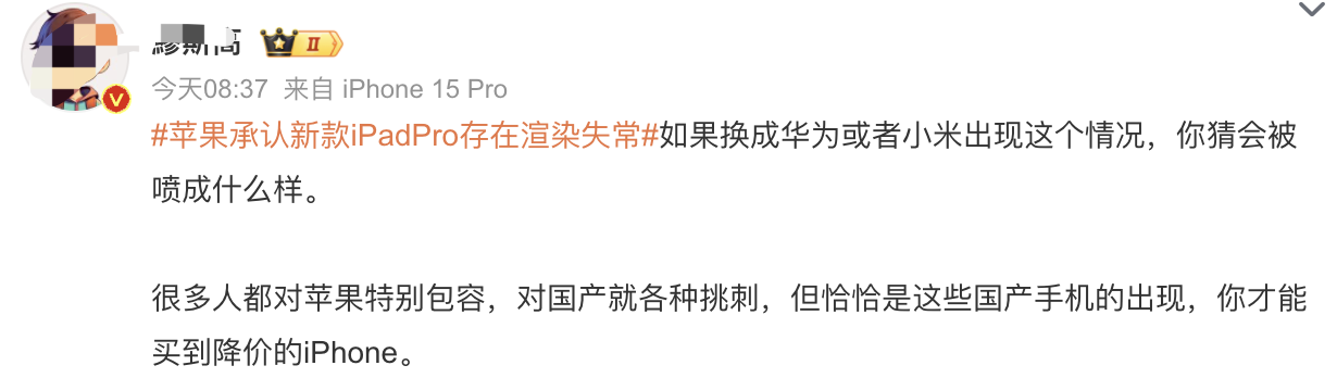 還有網友表示"如果換成華為或者小米出現這個情況,你猜會被噴成什么樣",他覺得大家對蘋果太包容了。
