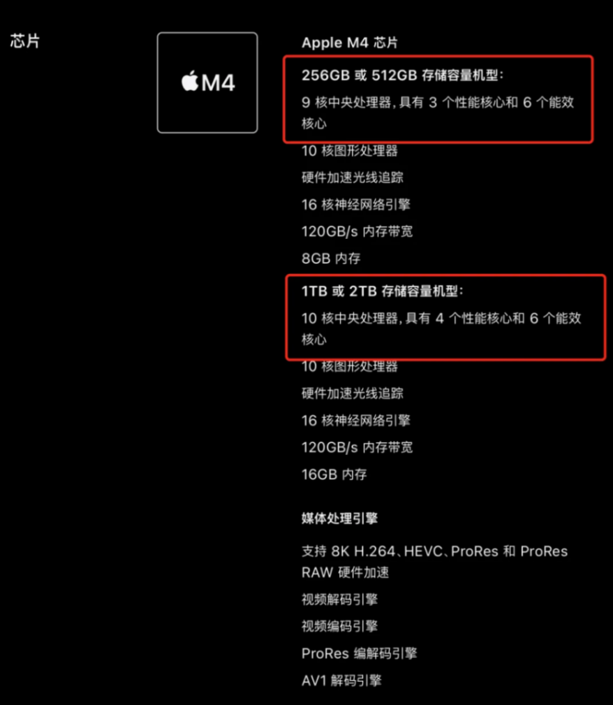 再說回這次新款iPad Pro,都說是最強的,但除了貴還是有不少『值得吐槽』的地方,比如新iPad Pro有四個存儲版本,其中只有1TB和2TB版才搭載『滿血M4』,而256GB和512GB版則在CPU部分閹割了一顆性能核心,加上只有8GB運存,性能肯定會弱一些。