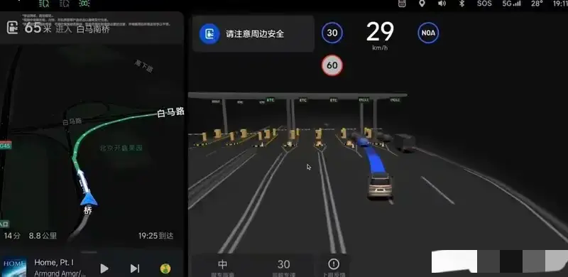 接下來要說的是這次升級中最讓我感興趣的部分——高速NOA能自動通過收費站了。開啟這個功能后,我們可以選擇人工或ETC通道。盡管目前只在部分收費站實現,但這確實是向全自動駕駛過渡的一大步。想象一下,在長途駕駛中,車輛能夠自行選擇通道并完成繳費流程,這對于提高行車安全性和便利性都是大有裨益的。