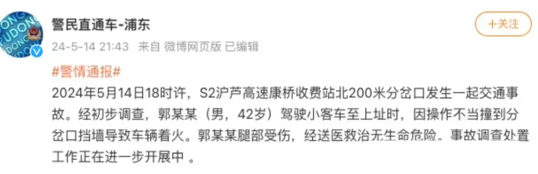 事故發生后,警方迅速介入調查。根據@警民直通車-浦東于5月14日晚發布的通報,事故發生的具體時間為18時左右。經初步調查,駕駛員郭某某(男,42歲)在駕駛過程中因操作不當,導致車輛撞擊分岔口的擋墻,隨后車輛起火。在事故中,郭某某腿部受傷,但幸運的是,經過緊急送醫救治,目前沒有生命危險。警方表示,事故的調查和處置工作仍在進一步開展中。
