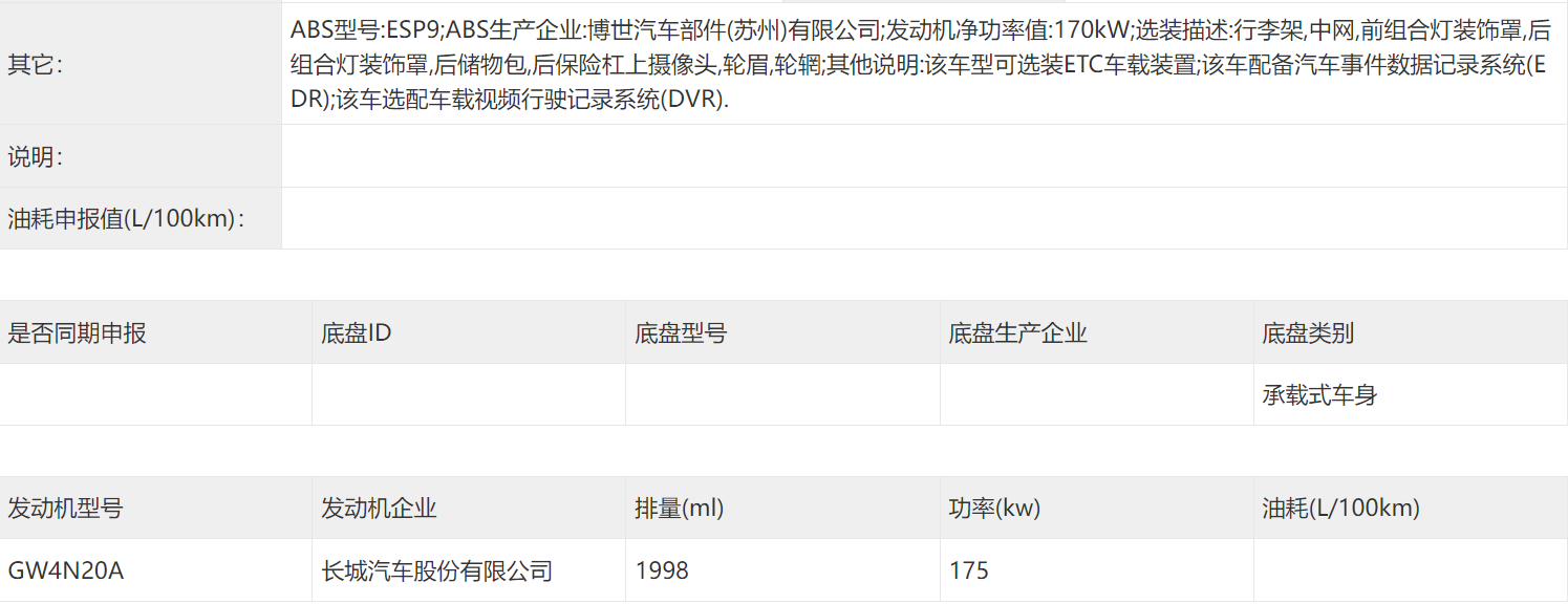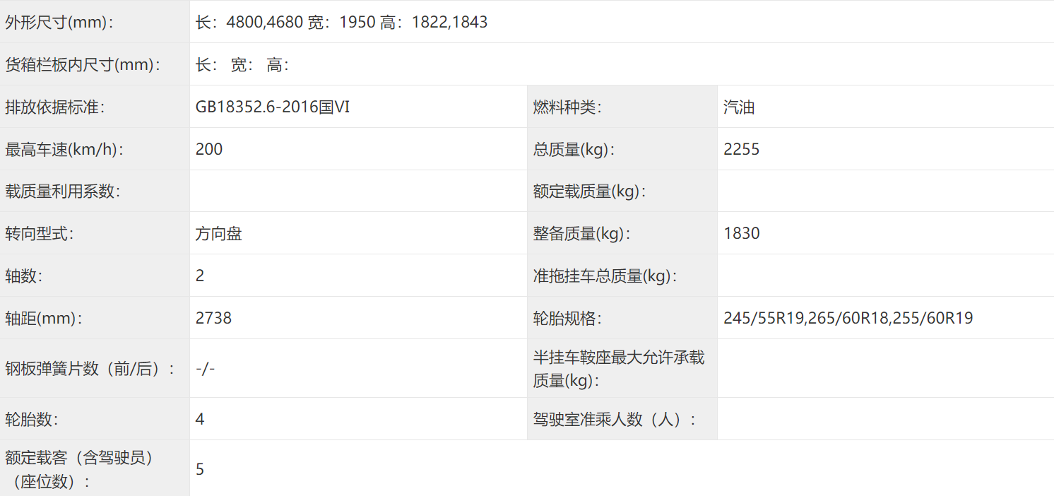 車身尺寸方面,新車申報的長寬高分別為4800(4680)/1950/1822(1843)mm,軸距為2738mm,與哈弗猛龍Hi4保持一致。