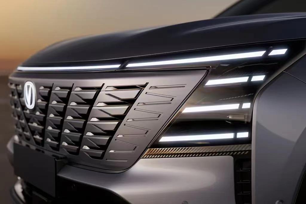 從得到的官圖來看,全新長安CS75 PLUS前臉繼續采用無邊框式進氣格柵,但格柵內部換成了帶折線的全新結構進行填充,并輔以點陣式鍍鉻元素來點綴。大燈組也有所調整,格柵上方是一條貫穿式燈帶,長安LOGO還可進行點亮,兩側各加入三條額外的燈帶,并將遠近光燈融入其中,點亮以后的視覺效果頗為醒目。