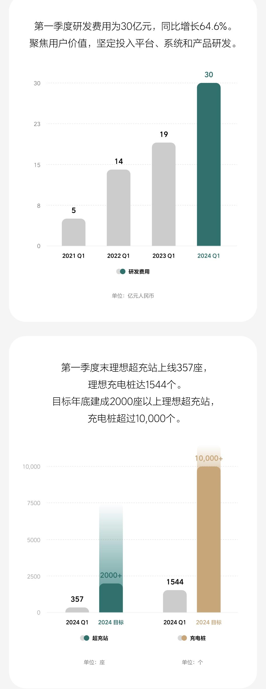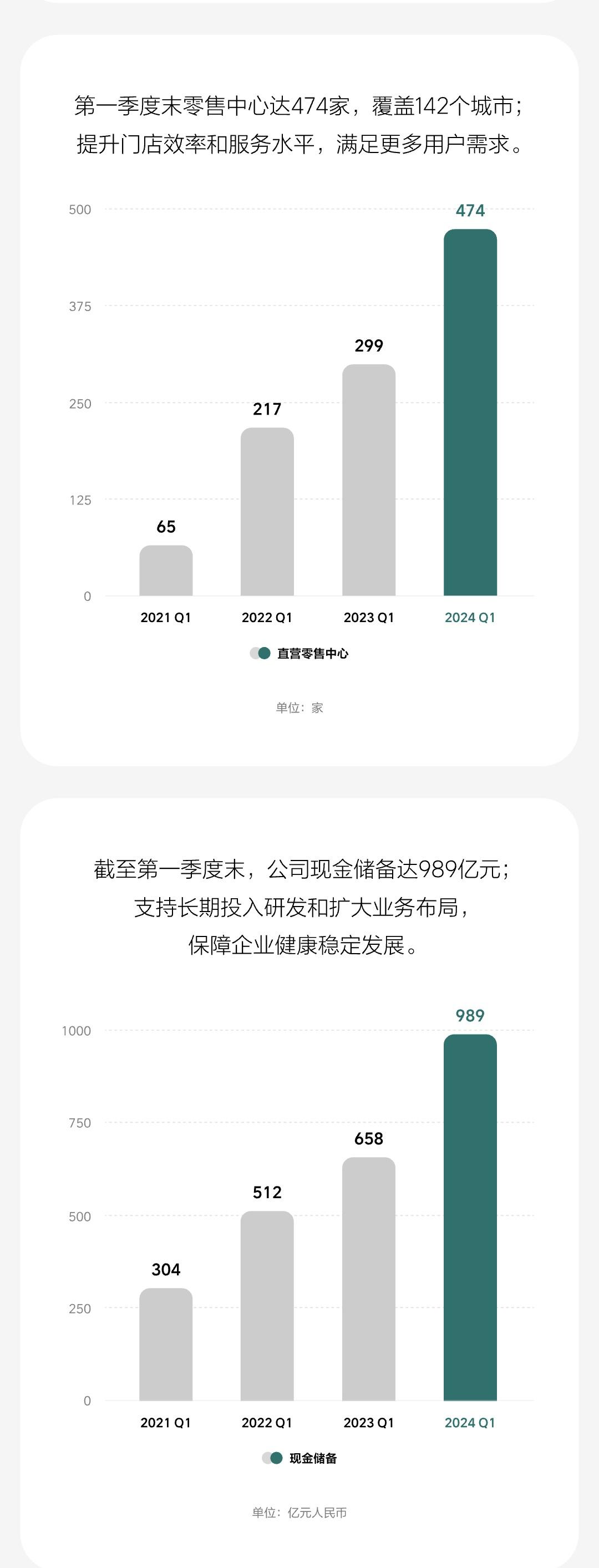 第一季度末理想超充站上線357座,理想充電樁達1544個。目標年底建成2000座以上理想超充站,充電樁超過10000個。此外,在第一季度末零售中心達474家,覆蓋142個城市;提升門店效率和服務水平,滿足更多用戶需求。