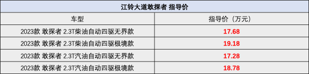 現款在售的江鈴大道敢探者共有4款車型,價格區(qū)間為17.28萬至19.18萬,包括2款柴油動力車型和2款汽油動力車型。值得一提的是,敢探者全系汽柴油動力車型均搭載2.3T+8AT的組合,在同級別車型中動力的優(yōu)勢還是很突出的。