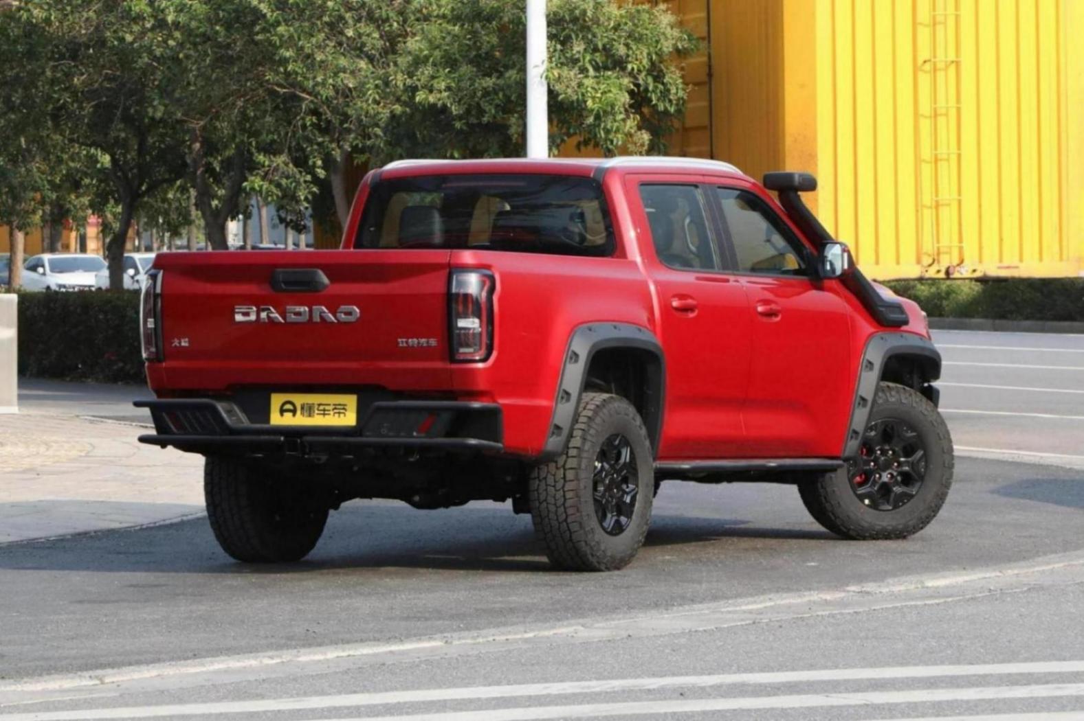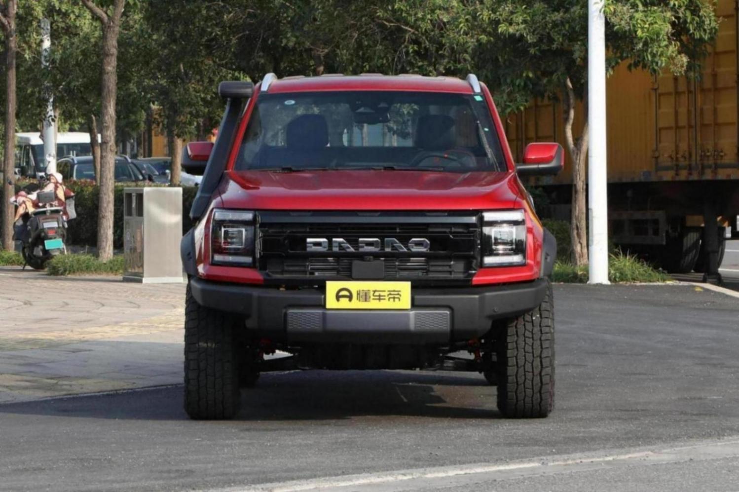 在造型方面,敢探者很有美系肌肉車的即視感,全車采用了直線條勾勒,尤其是充滿力量感的前格柵,加上熏黑的設計,中間鑲嵌著“大道”的logo標識,辨識度很高。在全車輪拱處還加入了裸露的鉚釘設計,這些都讓這臺敢探者看上去充滿肌肉感。