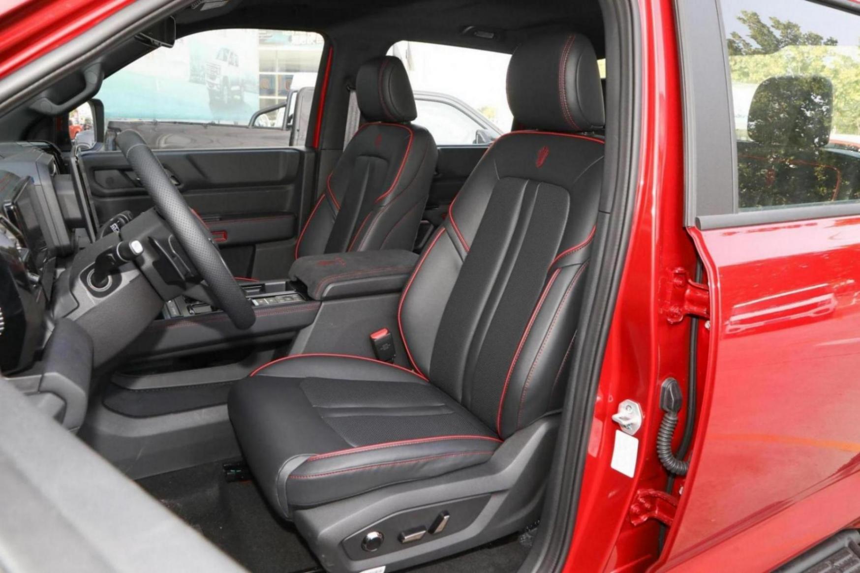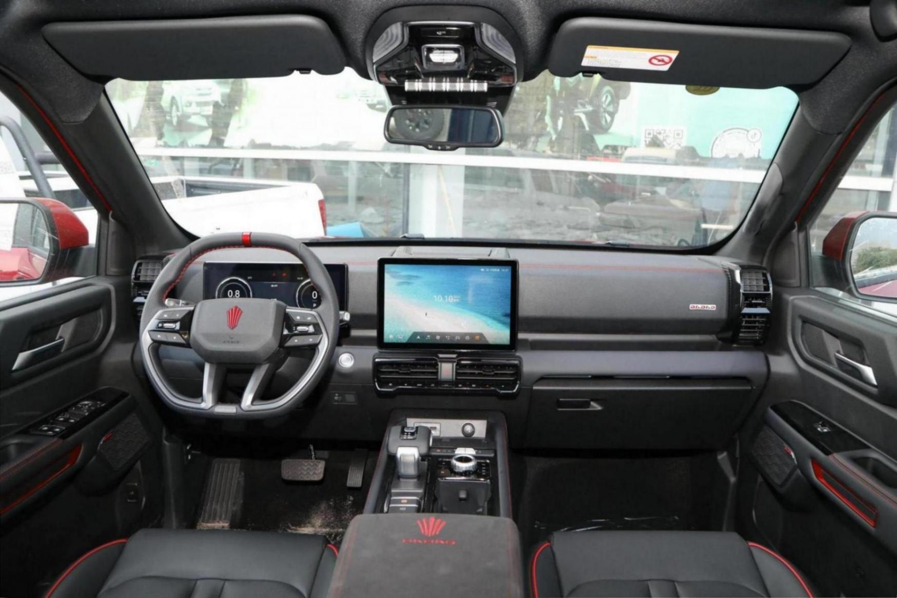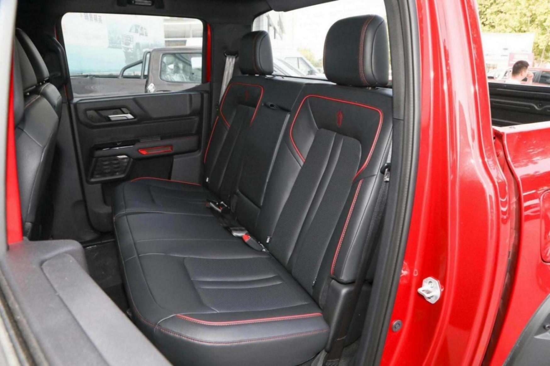 在內飾設計上,敢探者和大部分定位中高端皮卡車型一樣,向乘用化發(fā)展,內飾基本都采用了軟質材料的包裹,同時融入了紅色的縫線工藝,以烘托運動的氛圍。敢探者標配了12.3英寸全液晶儀表盤以及12.1英寸中控屏幕,值得一提的是,敢探者的中控屏幕支持左右調節(jié),內置了高通6125芯片,可以方便副駕駛的朋友使用屏幕。