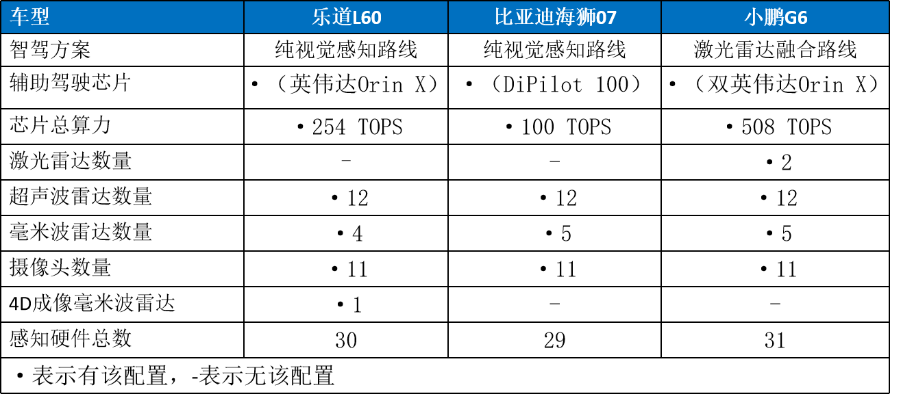 在硬件質量數量上,走激光雷達融合路線的小鵬G6明顯是最強的,不僅有兩顆激光雷達,它還有英偉達DRIVE Orin-X自動駕駛芯片(算力508TOPS),再加上超聲波雷達、攝像頭,全車的智駕傳感器能去到31個。