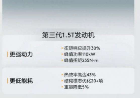 兩款車型均搭載第三代1.5T發(fā)動(dòng)機(jī),峰值功率110kW、峰值扭矩235N?m,熱效率達(dá)43%;超混專用DHT變速箱、P1+P3雙電機(jī)構(gòu)型,峰值功率176kW、峰值扭矩390N?m。官方稱綜合續(xù)航1300km+,虧電油耗低至6.15L/100km。
