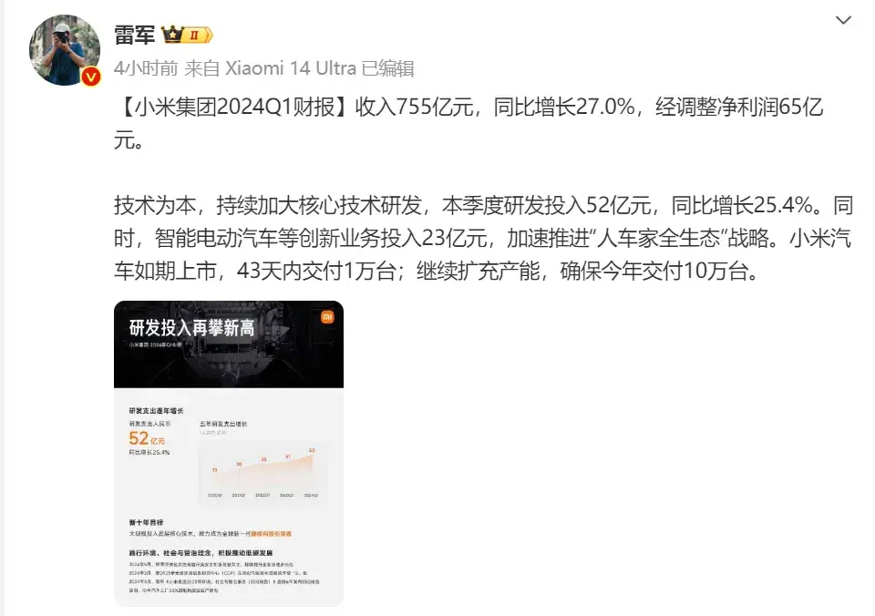 一季度財報顯示,小米當期研發開支由2023年第一季度的41億元增加25.4%至2024年第一季度的52億元 ,主要是由于與智能電動汽車業務及其他創新業務相關的研發開支增加所致 。