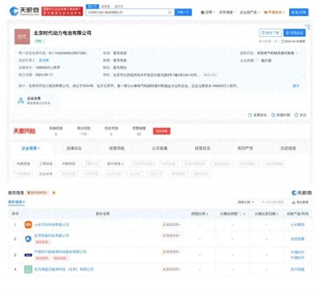 通過天眼查的股權穿透功能,我們可以清晰地看到北京時代動力電池有限公司的股權結構。該公司由多家業(yè)內(nèi)知名企業(yè)共同持股,其中包括小米汽車科技有限公司、寧德時代新能源科技股份有限公司以及北京京能科技有限公司等,這一組合無疑為公司的未來發(fā)展注入了強大的資本和技術支持。