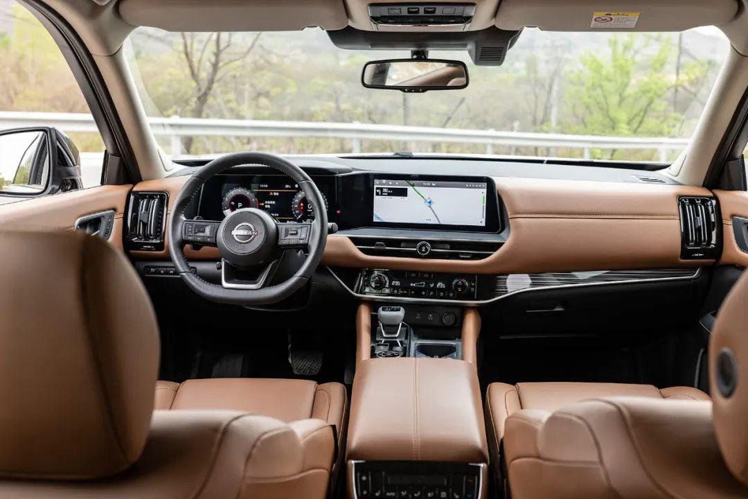 內飾部分,日產探陸的內飾設計簡潔而富有科技感。內飾采用了漸變的木紋飾件以及大面積皮革包裹,賦予座艙豪華感和品質感,手感細膩舒適的同時也讓整體氛圍更加豪華。12.3+12.3英寸S型無縫雙聯屏引人注目,雖然不少功能都被集成在了中控屏之中,但常用的空調、座椅加熱等功能依舊還是獨立實體按鍵,方便老司機在開車的時候進行快速盲操,這樣的設計我是非常認可的。