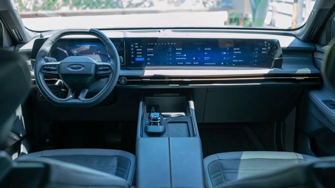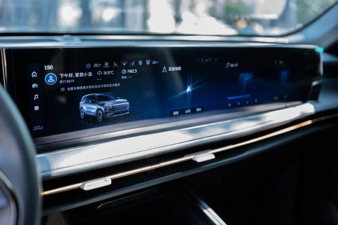 福特銳界L的內飾設計與日產探陸有著不小的設計差異,簡約的兩塊大連屏,將所有功能都集成在了屏幕之中,駕駛過程當中如果需要進行調節就會變得麻煩一些,畢竟就算再熟悉這款車機也很難進行盲操。銳界L給副駕準備了一塊娛樂屏幕,中控屏幕和副駕屏幕實際上是一塊很長的23英寸屏幕,不過這樣設計的缺點則是副駕屏幕總感覺并沒有正對著副駕駛。雖然都是燃油車,但是內飾上確實有一種隔代的既視感,相比之下探陸的內飾更符合現代家庭的使用習慣。