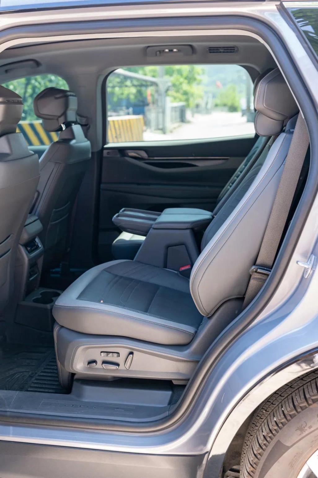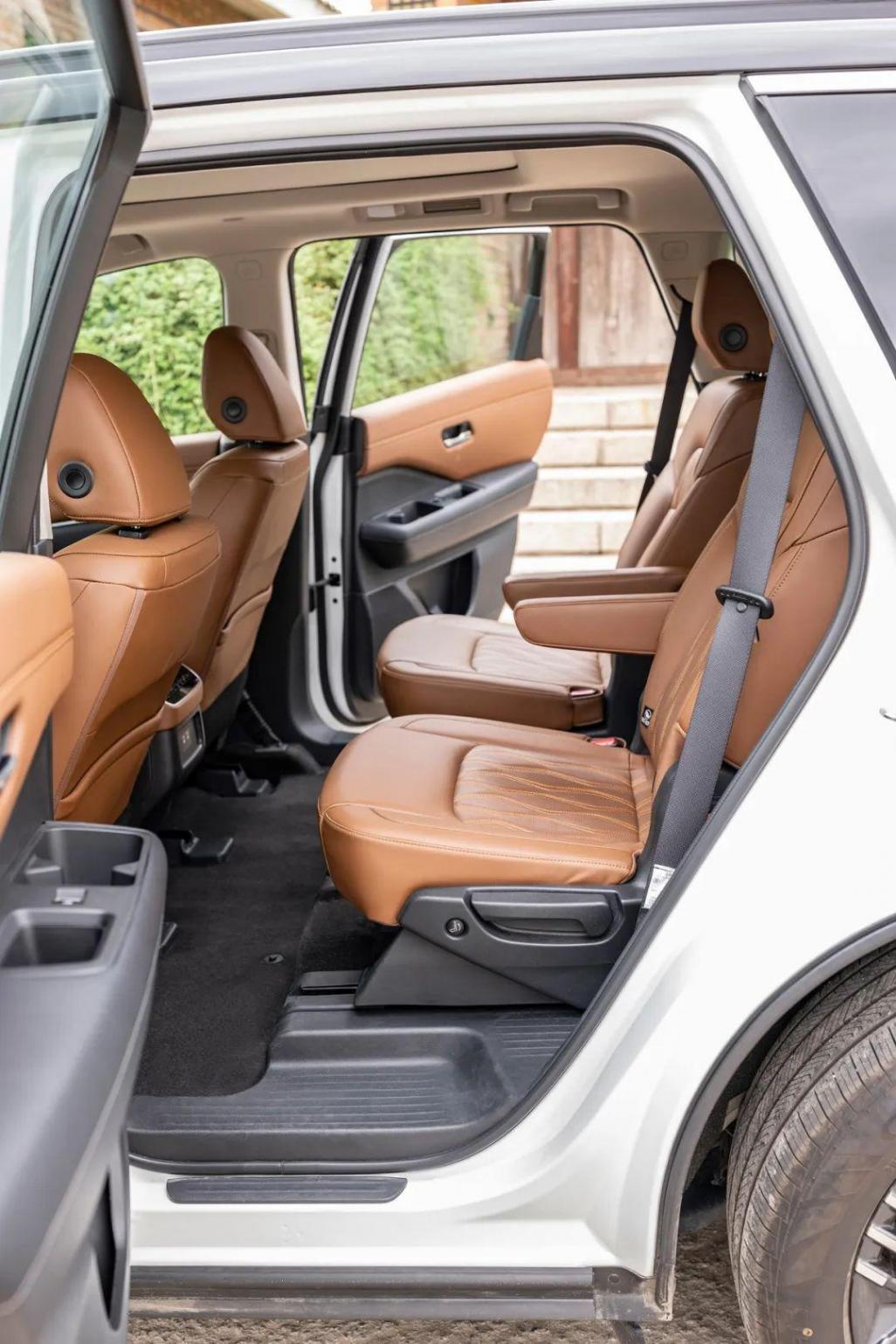 首先讓我們來看看大家庭用戶最關注的空間部分,日產探陸作為一款六座/七座SUV,在本次對比當中我選擇了六座版本,空間布局和乘坐感受會更好。238mm人性化中央通道讓我們進入第三排的時候更加方便,并且探陸還支持第三排一鍵進入功能,也就是說除了常規的從第二排兩個座椅中間進入,還可以按一下第二排座椅下方的按鈕,椅子就會自動往前翻折,空間也預留了足夠寬的腿部、膝部、腰部空間,即使成年人上下車也通暢無阻礙。