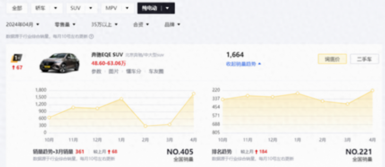 新能源毫無疑問就是未來的大趨勢,這一點從新能源逐年占據乘用車銷量的比重就能看出來。而當下汽車行業的競爭形勢也愈發激烈,各個細分市場都在充分競爭。因此看銷量榜單,不能像以前那樣看一個總榜,而是要看各個細分市場的變化,才能了解汽車行業的各個趨勢和導向,得出有價值的結論。例如4月份,筆者就關注到,35萬以上的合資豪華車,純電車型,奔馳EQE純電SUV就拿下了冠軍。那么它在這個細分市場有何優勢?我們來了解一下。
