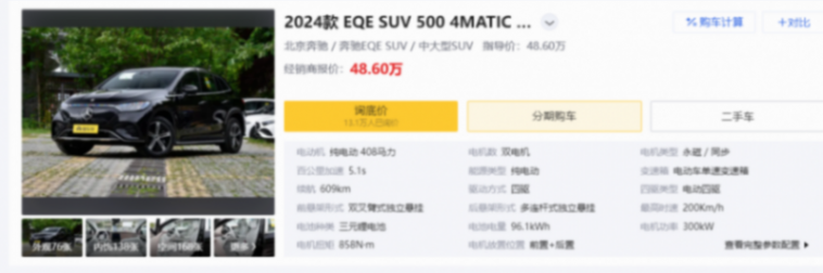 純電的合資豪華車領域,競爭相對更低一些,但也有例如寶馬i5和奧迪Q5 e-tron這樣的實力車型。而EQE SUV和第二名的奧迪Q5 e-tron是明顯甩開了差距的,這臺車定位中大型SUV,入門型號的指導價都在48.6萬,頂配型號達到63.06萬。今天單獨講入門型號也就是2024款 EQE SUV 500 4MATIC 先鋒版拎出來,解讀一下它的產品力表現,看看為何這臺車能受歡迎。