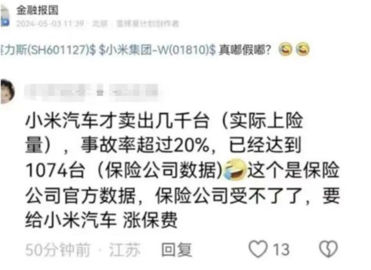 就在小米SU7銷量一路高歌猛增的同時,小米SU7也遭遇了大量車型質量投訴。自小米SU7交付以來,各種事故報道頻發,其中不乏制動失靈、高速輔助駕駛失靈等等危機用車安全的重要事故。除此以外,小米SU7也被質疑成為了車險公司的重要照顧對象,甚至車險保費媲美百萬級豪車,讓很多車主感覺“壓力山大”。