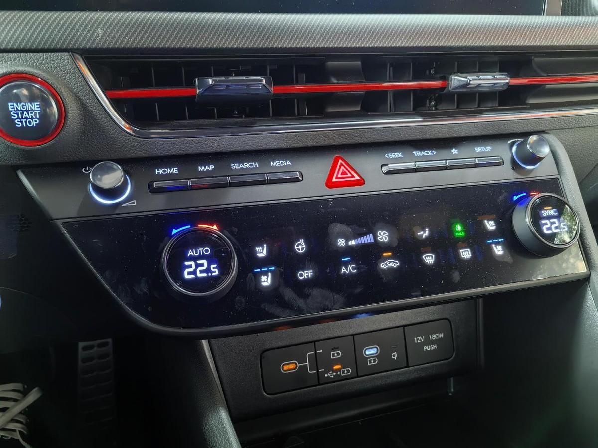 第十一代索納塔N Line車型有什么不一樣?外觀:前格柵、后備箱與翼子板處設有N Line標識。車身前后LOGO熏黑處理。運動前唇與競速導流尾翼。儀表盤顯示性能參數,包括油溫、扭矩和渦輪狀態。金屬踏板,紅色制動卡鉗,并設有N品牌徽標。雙邊四出排氣。內飾:中控臺采用碳纖維紋理飾板,拼接處采用紅色縫線。方向盤、座椅設有N品牌徽標,同時與車門內飾板共同采用紅色縫線