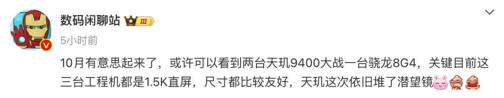今天,博主@數(shù)碼閑聊站 的一份爆料中提到:“10月有意思起來了,或許可以看到兩臺天璣9400大戰(zhàn)一臺驍龍8G4,關(guān)鍵目前這三臺工程機都是1.5K直屏,尺寸都比較友好,天璣這次依舊堆了潛望鏡”。