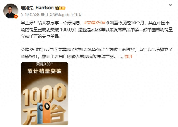 不久前,榮耀終端有限公司中國區(qū)CMO姜海榮宣布:“榮耀X50推出至今歷經(jīng)10個(gè)月,其在中國市場的銷量已成功突破 1000萬!這也是2023年以來發(fā)布產(chǎn)品中第一款中國市場銷量突破千萬的安卓單品。”