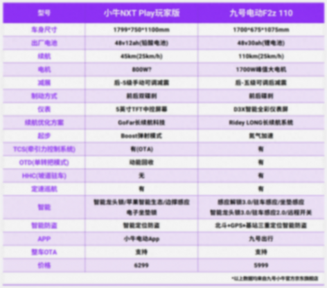 下面就來看看九號電動F2z 110和小牛NXT Play版的配置差異,單單看配置對比的話還是有區別的,電池電機智能體驗等等都有著不小的差異,下面就通過幾個維度來分析下小牛跟九號哪個更值得入手。