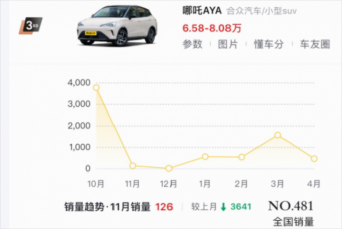 高端上不去,低價也不靈,7萬塊的哪吒AYA除了剛上市那會兒月銷還有3000臺以上,絕大部分月銷量就只有幾百輛,最差的一個月只賣了8臺??吹竭@個數字,我都替它忿忿不平。