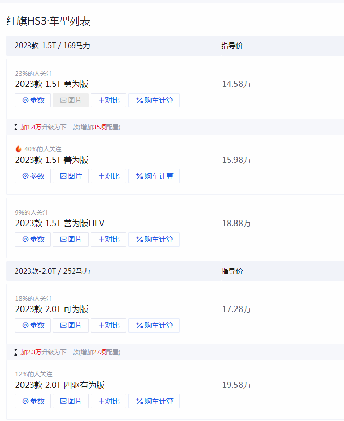 紅旗HS3這款車目前在售的車型共有5款,其官方指導價14.58-19.58萬元,整體的價格分布還是較為均勻。
