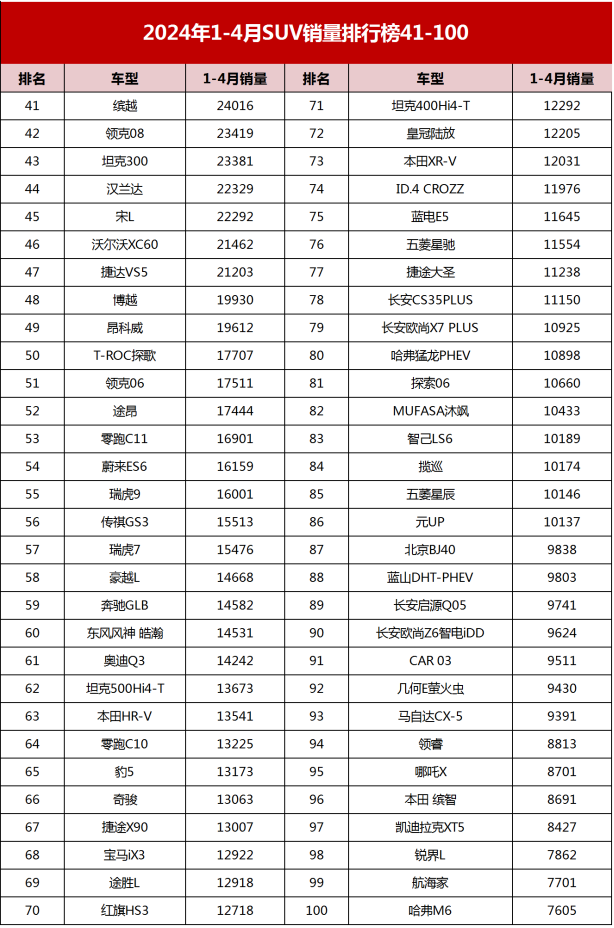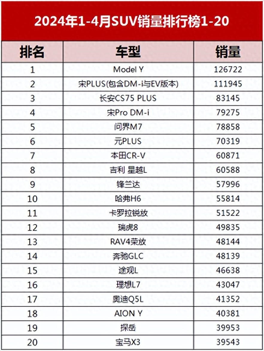 1-4月SUV銷量榜確認,比亞迪降價也賣不過特斯拉,日系排不進前6