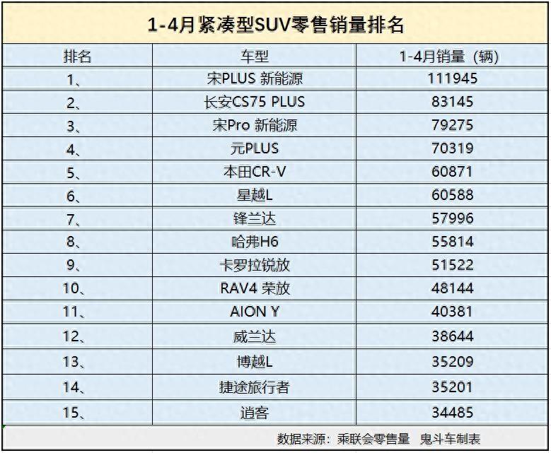 這一點(diǎn),主要體現(xiàn)在銷量上,日前,乘聯(lián)會發(fā)布1-4月緊湊型SUV零售銷量數(shù)據(jù),鬼哥整理出銷量排名前十五的榜單。接下來,看看哪些緊湊型SUV更搶手?
