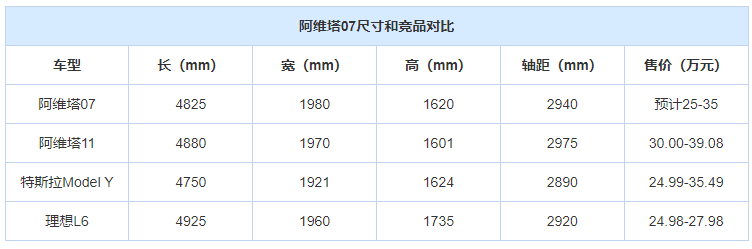尺寸方面,阿維塔07的長寬高為4825mm*1980mm*1620mm,軸距2940mm,除了車身高度,其他尺寸都要比Model Y更大。同時,對比理想L6,阿維塔07的車身更寬、軸距更長,理想L6則是車身長度和高度更有優勢。