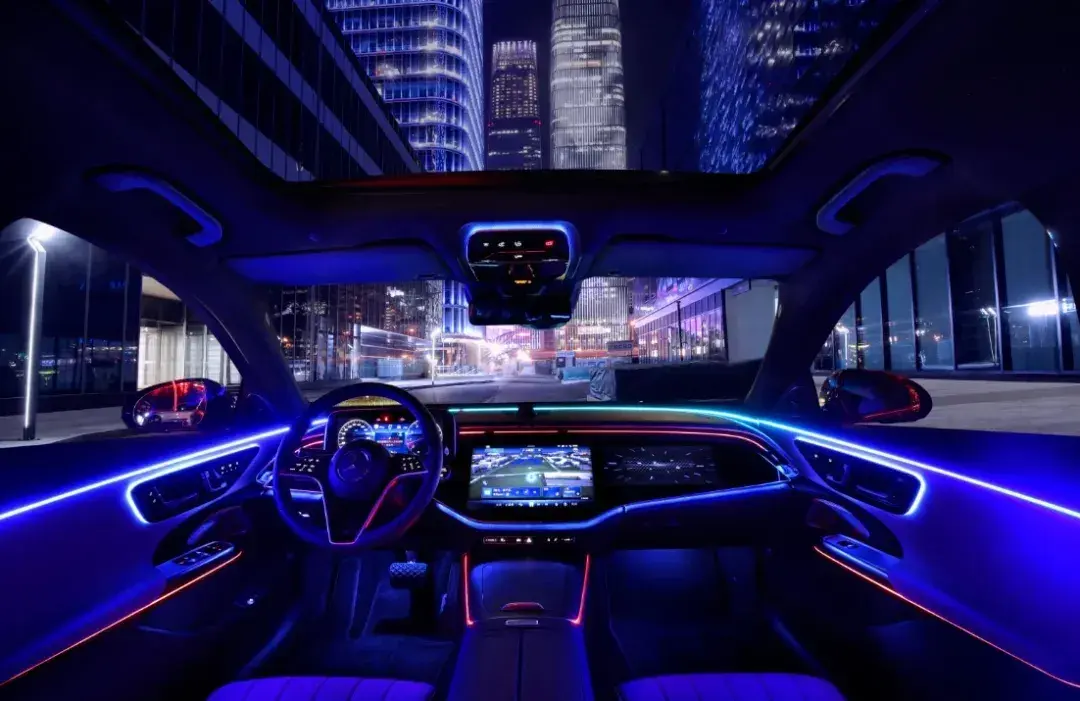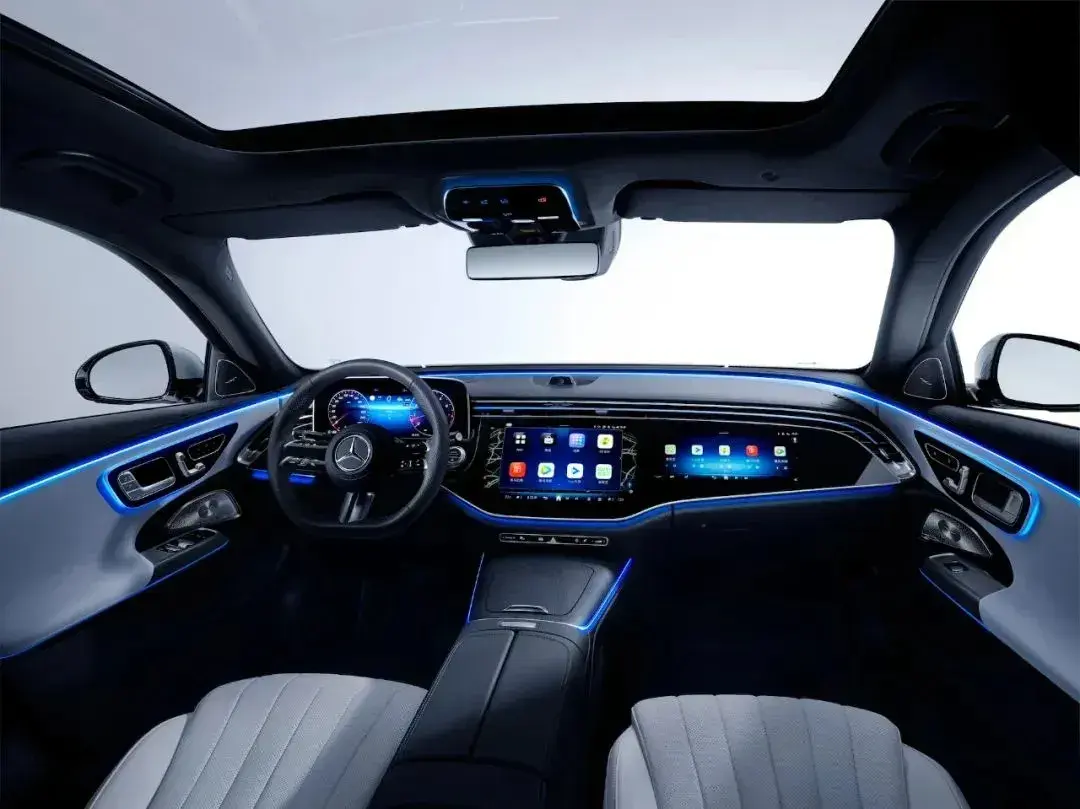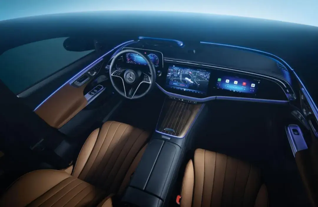 進(jìn)入車內(nèi),E 350 e L的座艙兼具豪華與科技。標(biāo)配的MBUX超級(jí)屏擁有14.4英寸中央顯示屏和12.3英寸前排乘客顯示屏,帶來前衛(wèi)的視覺體驗(yàn)。轎車采用棕色楓木飾板,運(yùn)動(dòng)轎車則選用黑色岑木飾板,搭配360度環(huán)繞式環(huán)境氛圍燈,實(shí)現(xiàn)隨音樂變化的燈光效果。