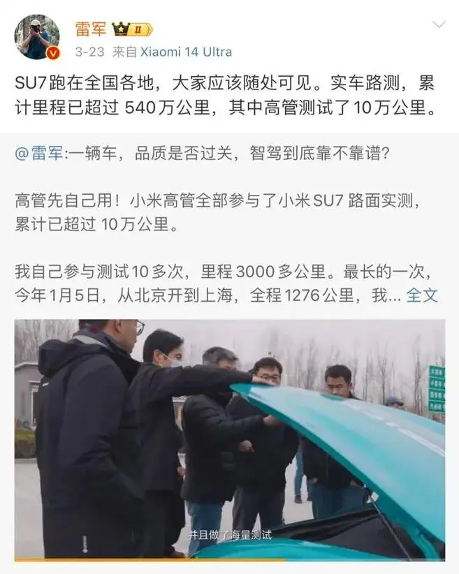 針對網上的輿論,小米汽車官方很快給出了回應:在小米SU7 Pro直播中,雷軍提到“15—20萬公里”、“全生命周期”,指的是小米SU7在標準測試車輛之外,投入了100輛測試車進行的全國公共道路測試。小米SU7在發布前的測試里程已超過540萬公里。