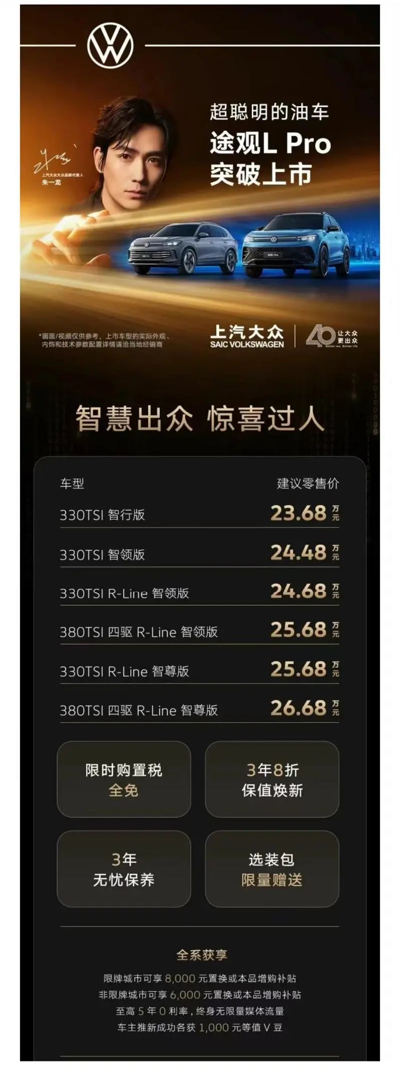 價(jià)格23.68萬元—26.68萬元,限時(shí)購置稅全免(廠家限定購置稅補(bǔ)貼最高2萬是個(gè)什么鬼?剩下的經(jīng)銷商自己補(bǔ)么?)、3年8折保值回購(3年后必須再次購買上汽大眾產(chǎn)品才能享受,里程、保險(xiǎn)、維修都有限制)、3年六次基礎(chǔ)保養(yǎng)、前4000名訂中高配的客戶分別可以免費(fèi)升級(jí)輔助駕駛和哈曼卡頓音響。