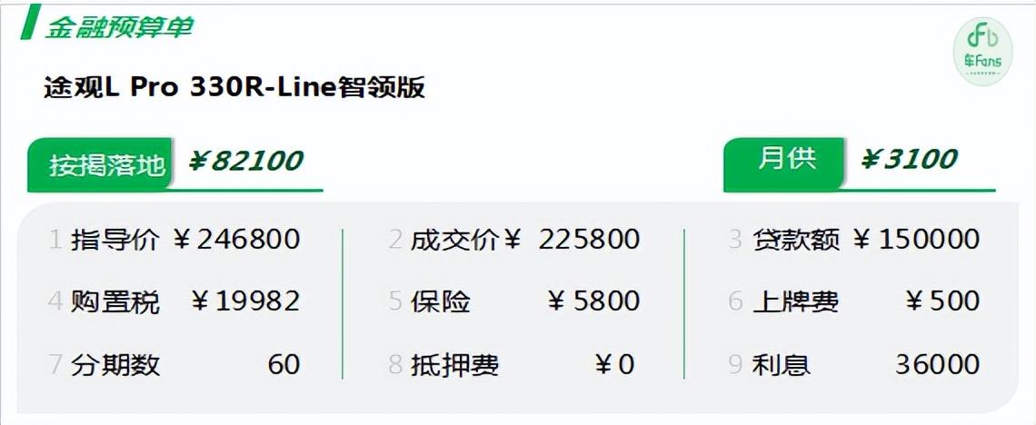 金融政策最高支持貸款4萬5年O利率,但這個(gè)方案基本沒人考慮。銀行分期貸款15萬5年車價(jià)能優(yōu)惠21000,是個(gè)不錯(cuò)的選擇,優(yōu)惠的錢基本能覆蓋2-3年的利息。以途觀L PRO 330 R-Line智領(lǐng)版為例,分期方案如下: