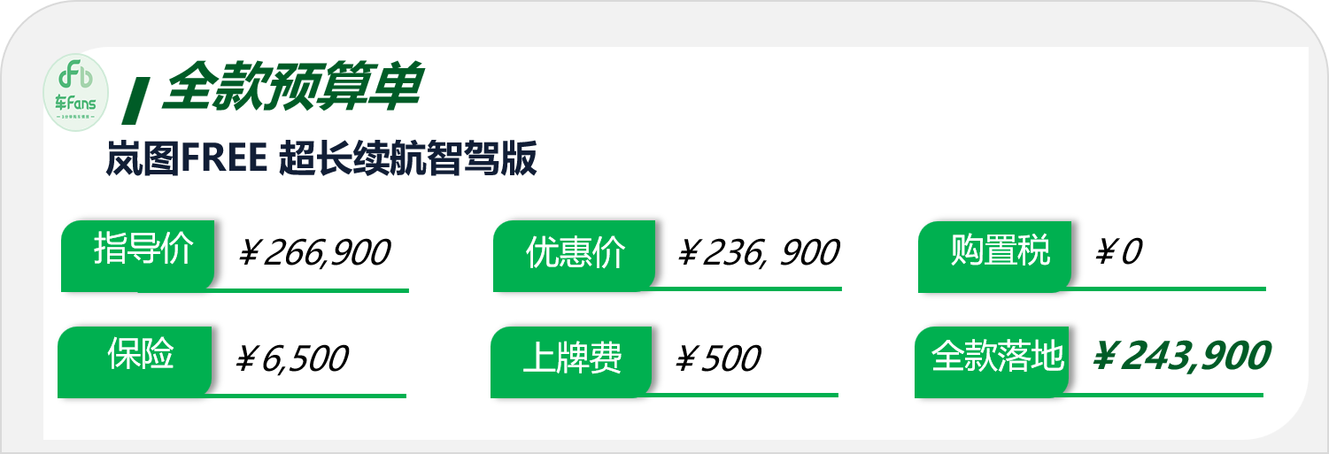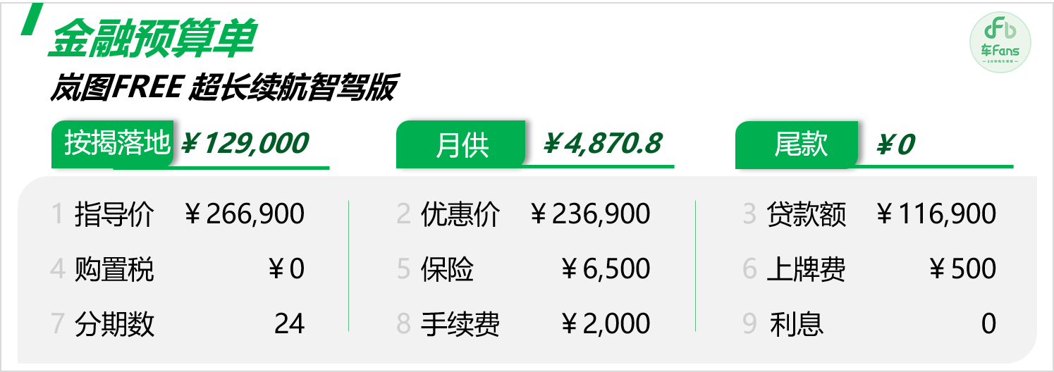貸款享受首付五成24期0利息,說實話作用有限,嵐圖FREE的客戶經濟實力普遍不錯,全款買車也沒啥壓力。