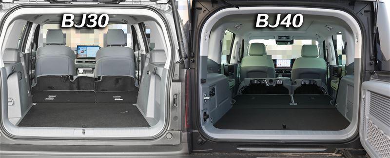 以上只是基礎(chǔ)價格和動力簡單數(shù)據(jù)羅列,在實際尺寸部分,北京BJ30就有以下犯上的實力。北京BJ30長寬高分別為4730/1910/1790mm,定位緊湊級SUV的數(shù)據(jù)看上去平平無奇,但其軸距達到2820mm,妥妥的中型SUV車型軸距。從實車視覺上也能看到出來,他并不小。要知道,他的“大哥”BJ40軸距也才2760mm,加上車尾的外掛式備胎,車長數(shù)據(jù)才僅為4790mm,且由于BJ40的尾門采用側(cè)開式布局,導(dǎo)致后備廂容積僅為同級主流水準(zhǔn)。加之北京BJ30繼承了大哥的優(yōu)點之一,后排座墊可掀起放倒靠背,后排座椅折疊后與大哥的后備廂容積可謂不相上下。下面放兩張圖,可以直觀感覺到。