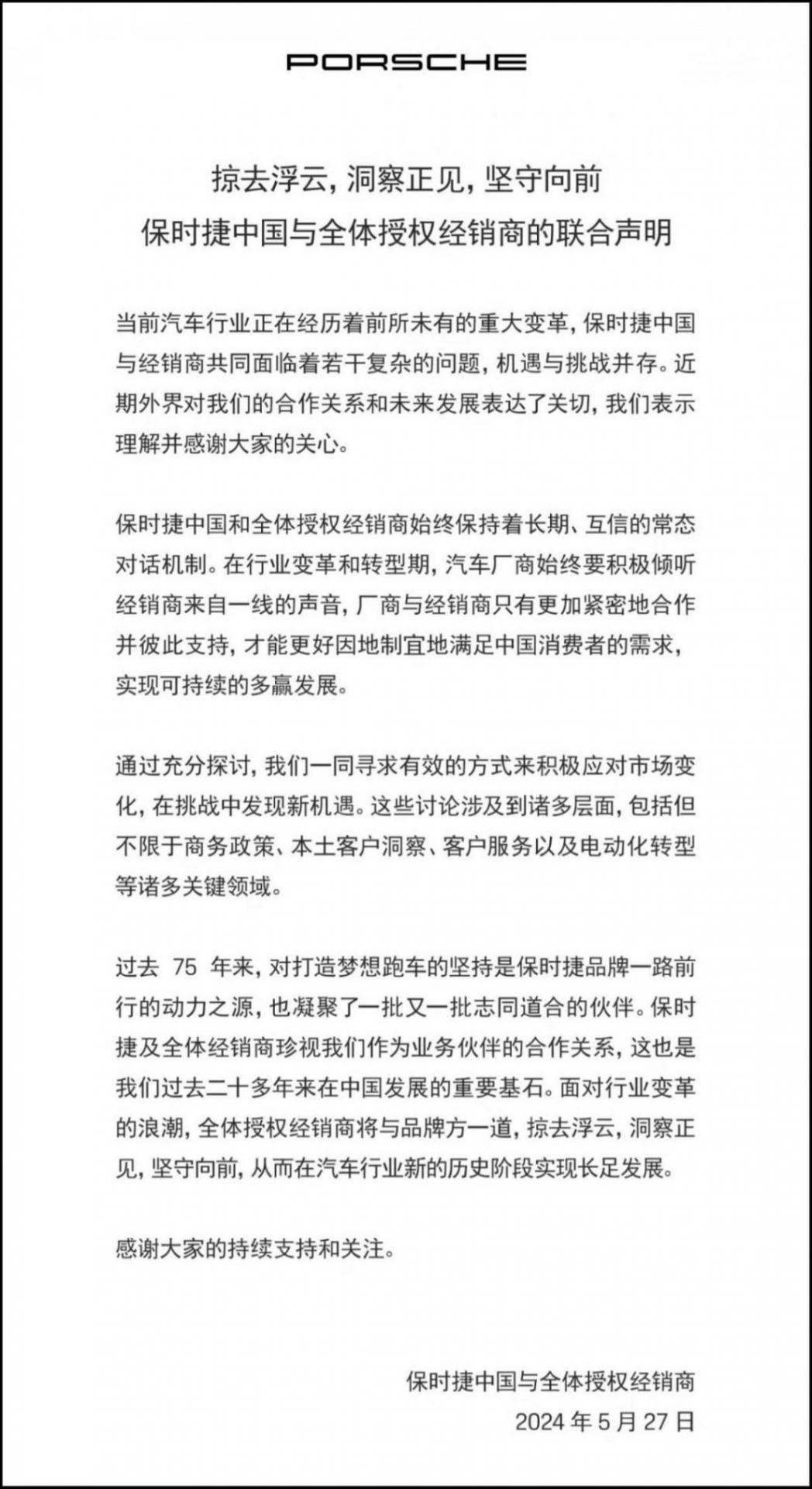 眼看事情越鬧越大,保時捷中國和授權經銷商還發布了一份聯合聲明,我看完之后的感受是:好像什么都說了,好像又什么都沒有說。反正就是“云里霧里,我在這里等你”!愛咋滴咋滴!