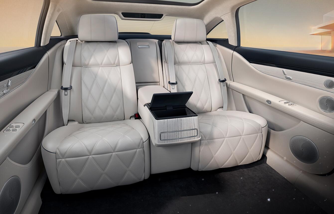 中央扶手箱處還有著翹起的液晶控制屏幕,進一步提升了交互體驗。全景大天幕,類似于投影屏的機構,層次感豐富的門板裝飾肉眼可見的多音源音響,隨處可見的木紋裝飾也提升了豪華的感覺。雖然圖中沒有公布,但例如前排座椅后方Maglink平板接口,后排手機無線充電面板,座椅按摩,Napaa真皮等元素都不會缺席,符合該級別應有的表現。而電冰箱手動遮陽簾小桌板四車窗雙層夾膠玻璃等都應有盡有。
