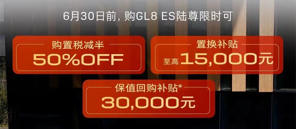 別克GL8陸上公務艙系列可享受購置稅減半、置換補貼至高10000元、保值回購補貼30000元,具體規則和ES陸尊系列保持一致。