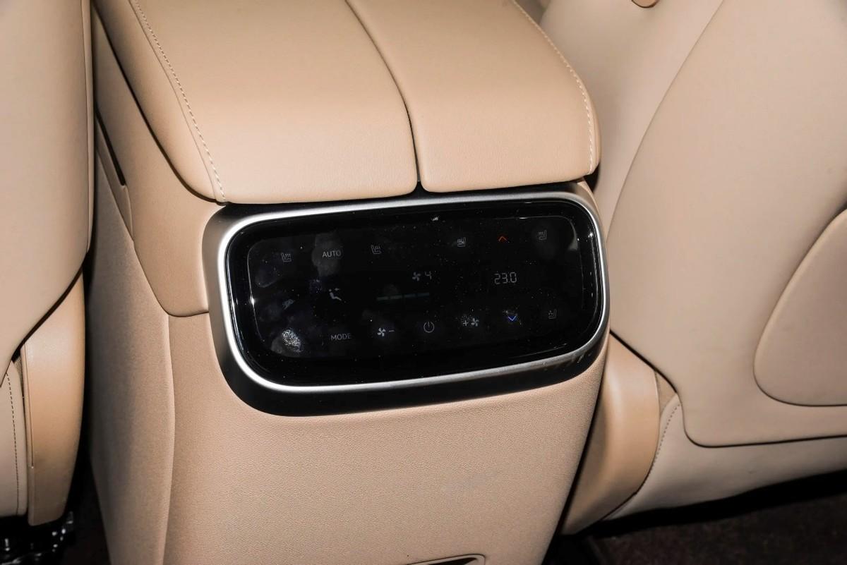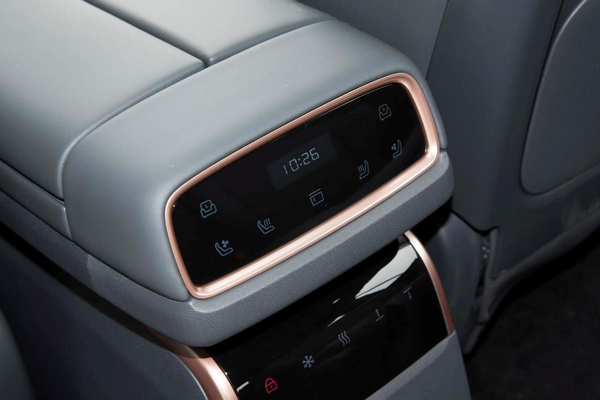 前排座椅中央的中控臺(tái)區(qū)域,提供了二排的觸控屏,可以支持二排左右的通風(fēng)及按摩、吸頂屏的升降等功能調(diào)節(jié)。觸控屏下方帶有支持冷熱兩用的車載冰箱,而且?guī)в歇?dú)創(chuàng)的前后電動(dòng)滑移功能,能夠在三排座椅之間移動(dòng),便于車內(nèi)其它乘員共用,非常別出心裁。
