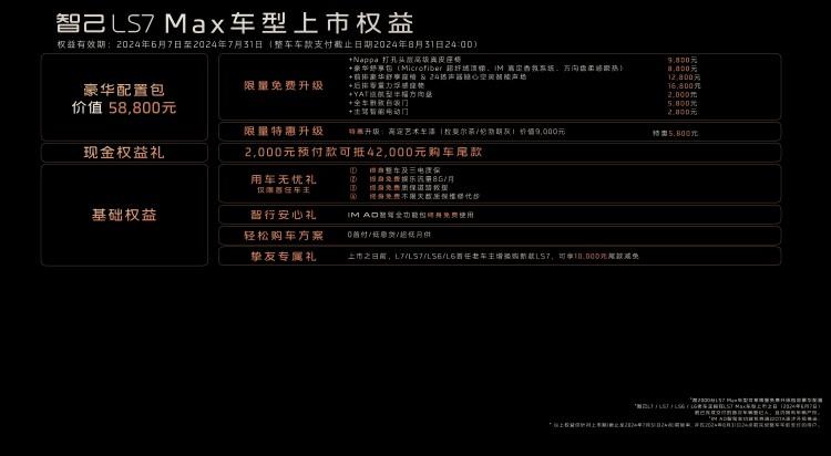 [新車上市]日前,智己LS7新增車型正式上市,此次推出Max Elite、Max Lux兩個配置車型,用戶預付2,000元,可抵扣42,000元購車尾款,上市權益價分別為299,800元、319,800元。