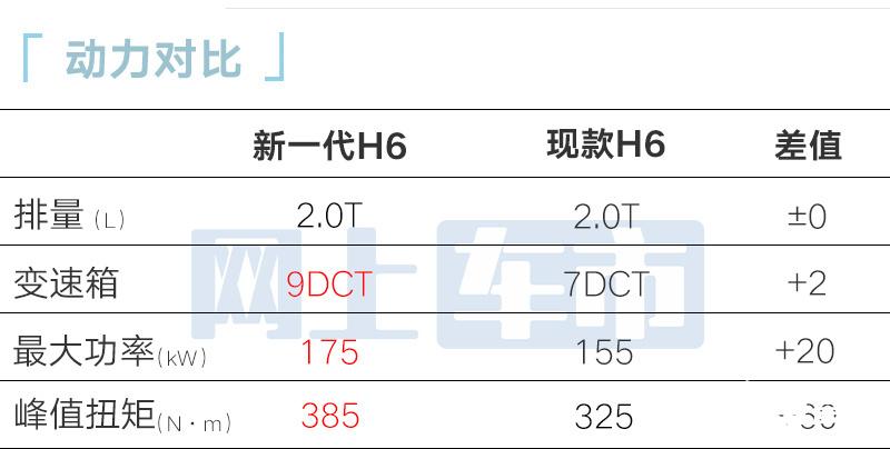 新一代H6繼續(xù)搭載1.5T與2.0T發(fā)動機,1.5T最大功率135kW,峰值扭矩275N·m,匹配7速濕式雙離合變速箱,WLTC工況百公里油耗7.1L,與現(xiàn)款一致;2.0T發(fā)動機與變速箱升級為二代大狗同款,WLTC工況百公里油耗7.5L左右。