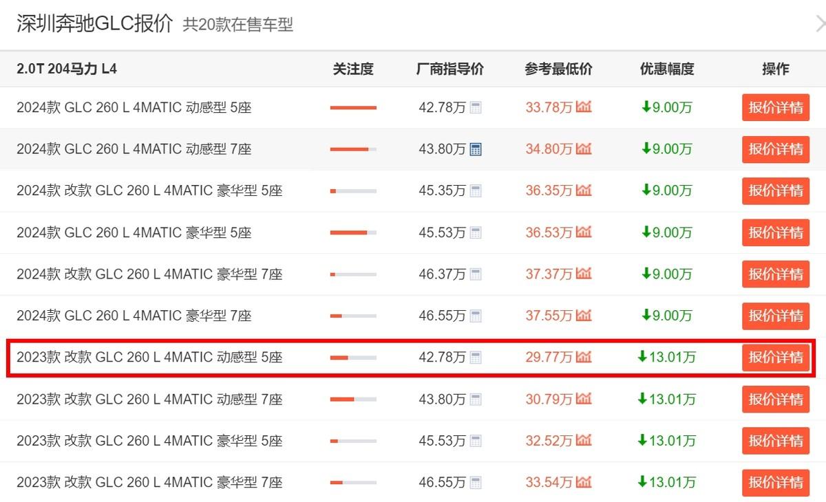 就以在去年才完成換代的奔馳GLC為例,在全國很多城市都已經給出了超10萬元的降價優惠,部分城市的最高降幅甚至一度來到了13.8萬元,其中2023款車型的入手門檻甚至還跌破了30萬元大關。雖說在降價幅度上并沒有奧迪Q5L和寶馬X3那么夸張,但奔馳GLC畢竟才剛完成換代,而奧迪Q5L和寶馬X3仍是老款車型,能給出更大的優惠力度也情有可原。