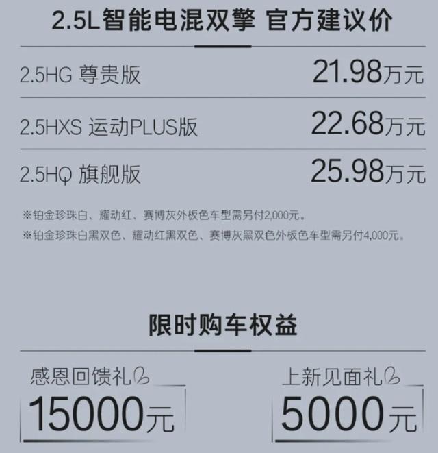 此次上市的新款2.5L雙擎版本凱美瑞一共擁有三款不同的配置,指導價21.98-25.98萬。廠家更是給出了終端1萬元的優惠以及2萬元的新車見面禮,變相優惠了3萬元,入門級價格更是來到了18.98萬。多年前的2.5L混動還是凱美瑞的絕對大旗艦,落地價接近30萬,沒想到現在的價格便宜到了這種程度。