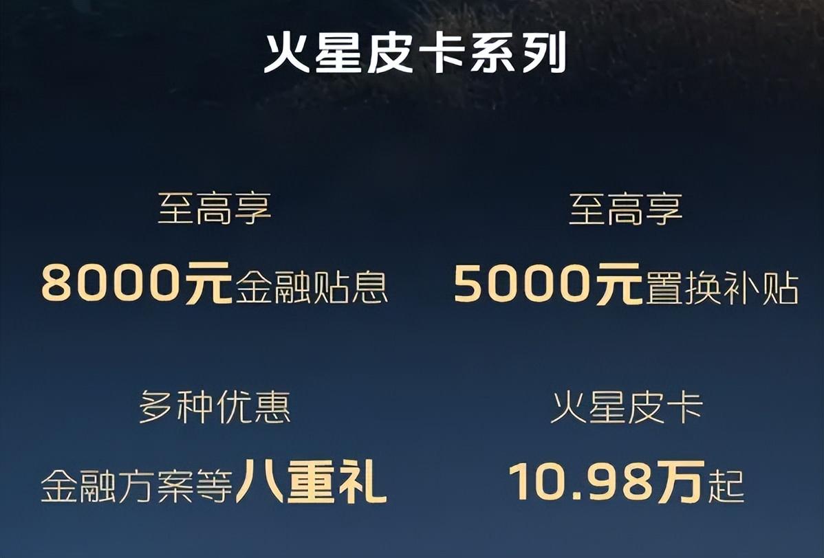 在6月期間,購置火星柴油48V混動皮卡和汽油皮卡均可享受0首付、0利息、0月供;此外,柴油48V混動皮卡可享受至高8000元的金融貼息,和至高5000元的置換補貼等八重禮,綜合優(yōu)惠高達13000元;購買火星皮卡汽油版可享受0首付、0利息、0月供,以及至高5000元金融貼息、3年10萬公里超長質(zhì)保、增換購等七重禮。