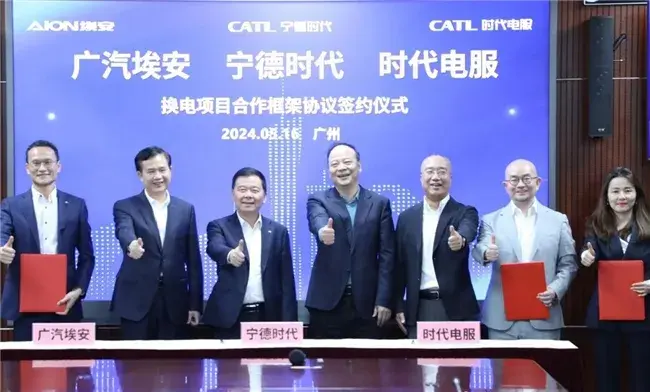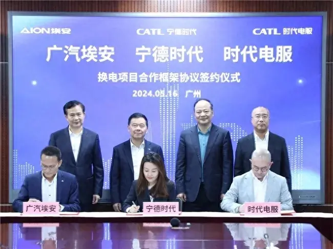 5月16日,廣汽集團旗下廣汽埃安與寧德時代、時代電服在廣汽中心簽署換電項目合作框架協議。根據協議,三方將在換電車型開發,換電塊開發、生產及流通,整車與電池數據管理,車輛質保售后服務等領域展開深入合作,共同推動廣汽埃安換電車型的銷售,為用戶帶來更高效、便捷的換電補能體驗。